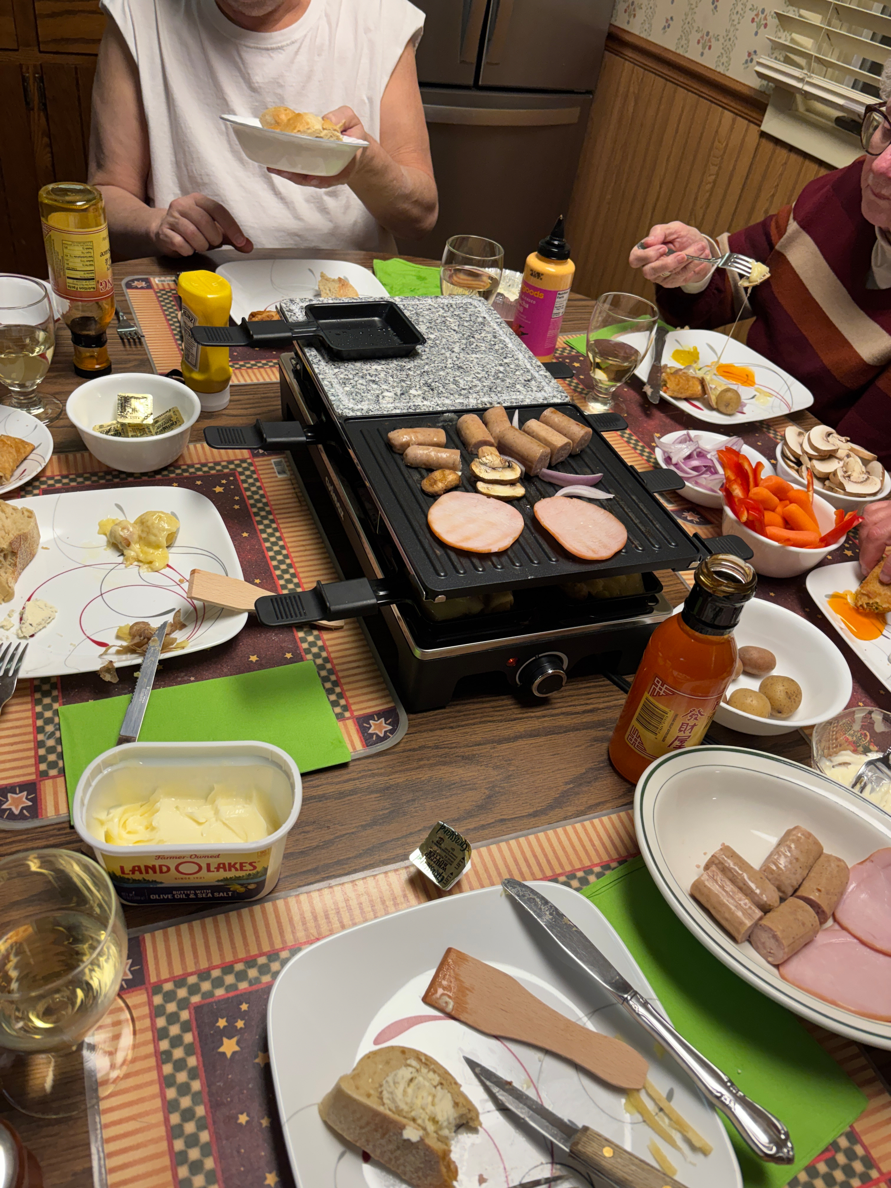 Second Christmas dinner: German Raclette American style at 8 pm on the 24th. We found a grill on Amazon, Raclette cheese at Lunds & Byerlys deli in the Twin Cities, and all other ingredients improvised locally.
